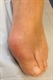 Although radiographic changes are usually a late feature, occasionally they may be seen at presentation, see figure 1. The most common presentation is a gout flare, characterised by acute onset of one, or occasionally more, hot, red, swollen joints which are extremely painful and exquisitely tender. Flares reach a peak in just 12-24 hours. Although any joint can be affected, most flares affect joints in the feet, knees, hands or elbows. Involvement of the first metatarso-phalangeal joint, termed podagra (seizing the foot), is very characteristic, see figure 2.