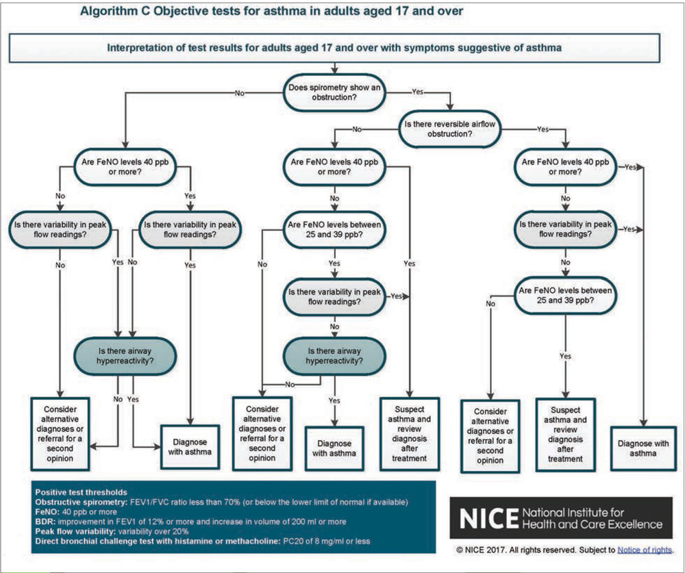 Moreover, clinical examination is frequently entirely normal. Clinical history alone is not sufficient to diagnose asthma.2 However, there is no single agreed gold standard diagnostic test and the more objective tests that aid diagnosis such as FeNO, although now integrated into national guidance, are not always available in primary care (see figure 1).2
