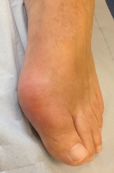 Although radiographic changes are usually a late feature, occasionally they may be seen at presentation, see figure 1. The most common presentation is a gout flare, characterised by acute onset of one, or occasionally more, hot, red, swollen joints which are extremely painful and exquisitely tender. Flares reach a peak in just 12-24 hours. Although any joint can be affected, most flares affect joints in the feet, knees, hands or elbows. Involvement of the first metatarso-phalangeal joint, termed podagra (seizing the foot), is very characteristic, see figure 2.