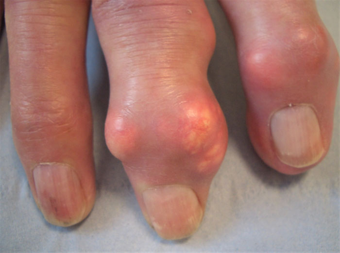 Patients may also present with subcutaneous tophi, especially older people. Tophi particularly occur on extensor surfaces of toes, fingers, heels, knees and elbows, appearing as nodules with heterogeneous consistency (unlike homogeneous rheumatoid nodules), sometimes with white-yellow discoloration – urate crystals are white. Patients may report previous gout flares but some present just with tophi or chronic joint symptoms.